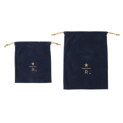 ネイビーのボディと、ゴールドのひもや刺繍で華やかな舞台幕をイメージした巾着型のポーチ。2サイズをご用意しました。小物をまとめるのにぴったりな普段使いしやすいSサイズ。また、マグカップ1個がちょうどよく収まるため、ギフトバッグとしてもおすすめです。Lサイズは、旅行時の荷物をまとめるのにもちょうどよい少し大きめのサイズです。タンブラー1個とコーヒー豆250gのパッケージが収まり、ホリデーのギフトバッグとしてもお使いいただけます。