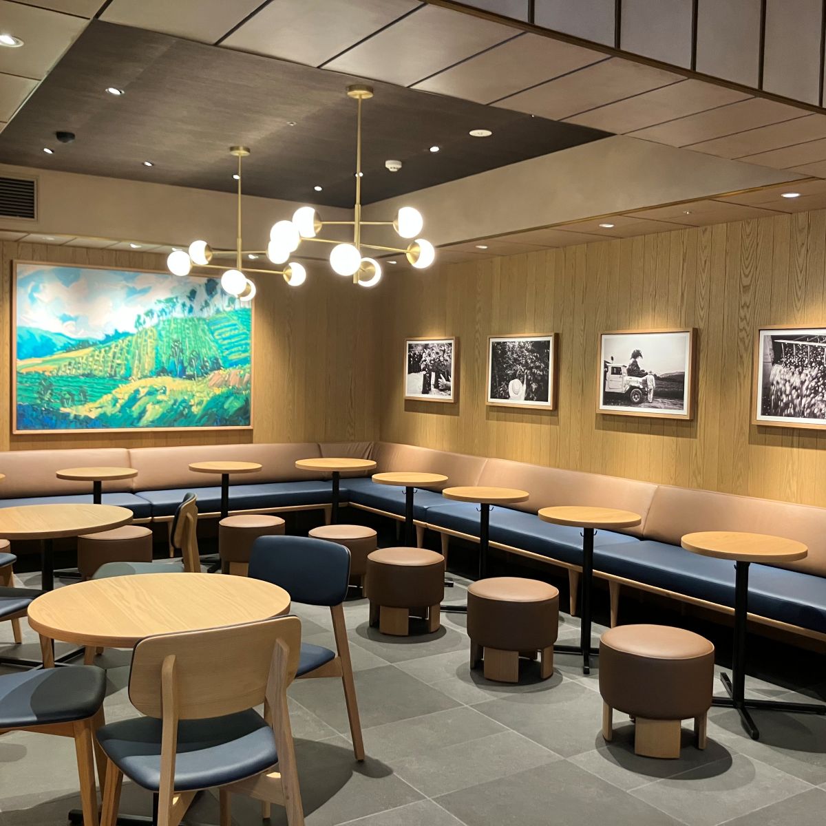 エスカレーターを降りるときに見えるSTARBUCKSのロゴと、その先に広がる松本美緒さんという若手アーティストの方によってコーヒーにまつわる人々が描かれた壁画が皆様をお迎えしています。広々とした店内と、座る席によって違う雰囲気を楽しめるここのお店はきっと何度も足を運びたくなるでしょう。