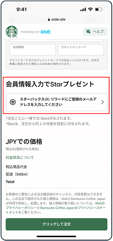 実施期間中にスターバックスのデリバリーサービスからご注文いただいた方に、1注文あたり10 Starsプレゼント。